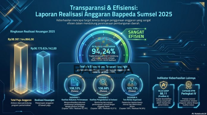 PALEMBANG – Sebagai perwujudan tata kelola pemerintahan yang akuntabel, Badan Perencanaan Pembangunan Daerah (Bappeda) Provinsi Sumatera Selatan melaporkan capaian realisasi anggaran dan tingkat efisiensi penggunaan sumber daya sepanjang tahun anggaran 2025. Melalui manajemen pengelolaan kinerja yang ketat, Bappeda menunjukkan komitmen dalam mengoptimalkan setiap anggaran untuk pencapaian target pembangunan daerah.